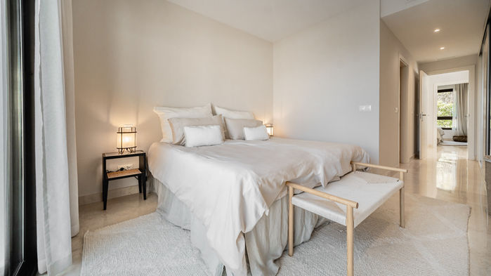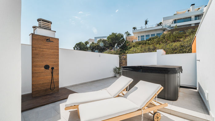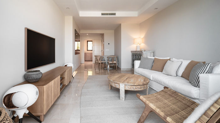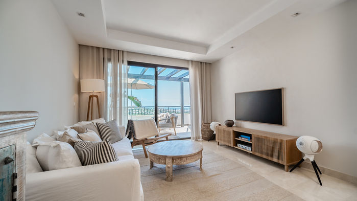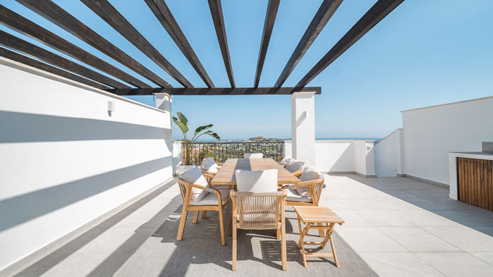 Cette luxueuse résidence de 80 m² offre un mélange parfait de sophistication et de confort, avec deux chambres spacieuses, deux salles de bains élégantes et un magnifique solarium de 75 m² qui offre des vues panoramiques sur la magnifique côte sud.