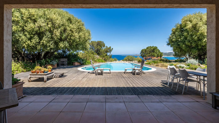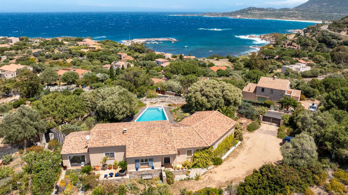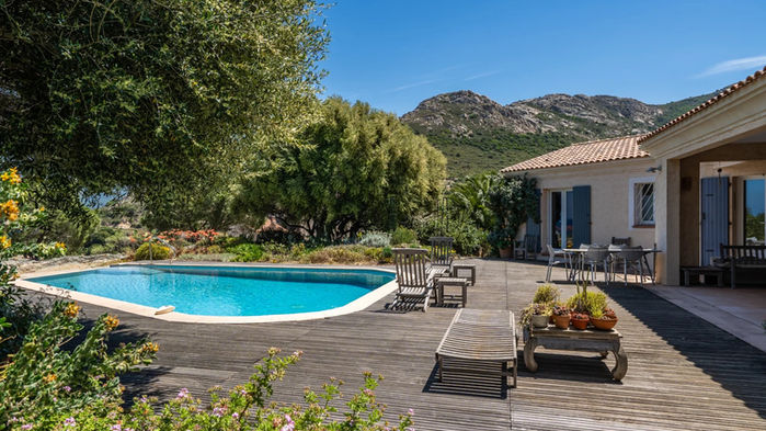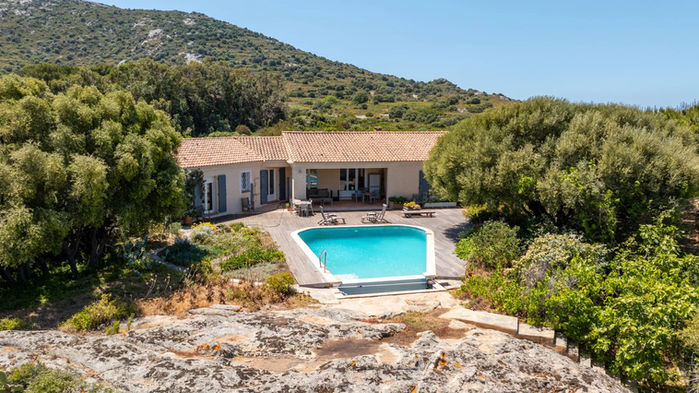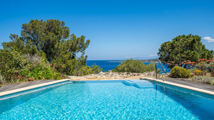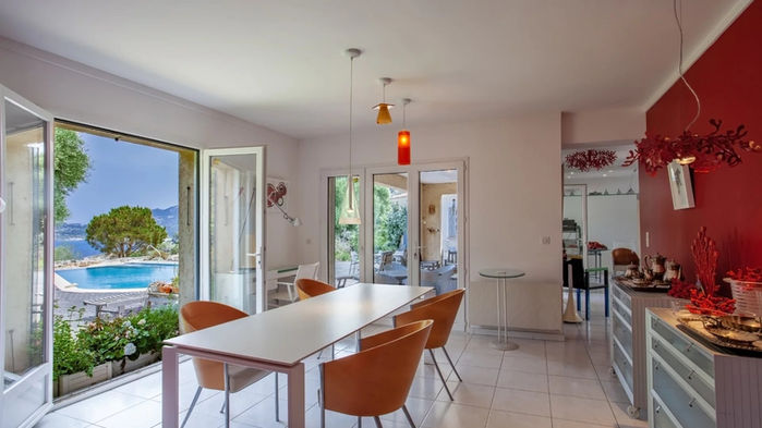 The villa sits on a landscaped plot of approximately 2,020 m², within a secluded and preserved coastal marina, with natural rock formations and an infinity pool surrounded by a Mediterranean garden filled with rare, exotic, native plants, and many rose bushes. On the mountain side, there is a permaculture garden with raised vegetable beds and an orchard featuring over 40 varieties of fruit (grapes, figs, almonds, pears, etc.).