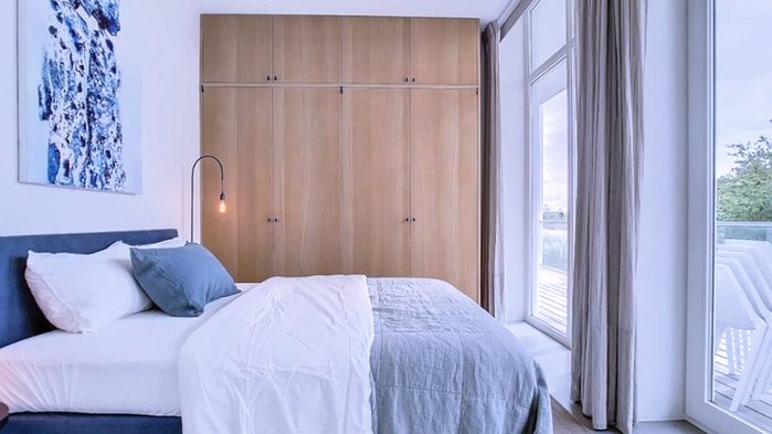 These rooms have a spacious bathroom with vanity unit and separate toilet, overlooking the dune landscape. Four bedrooms, three with built-in closets.