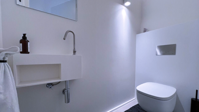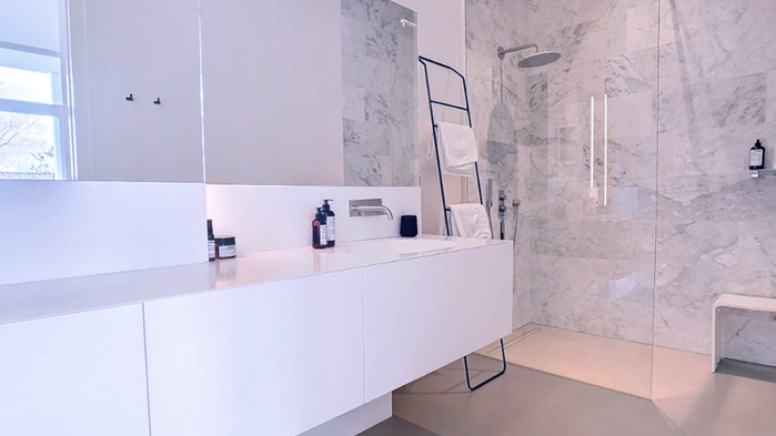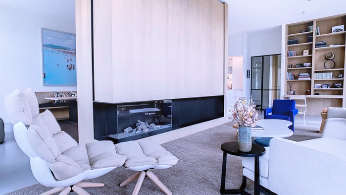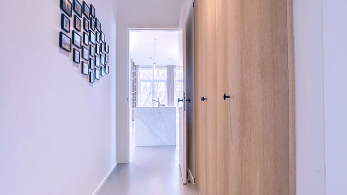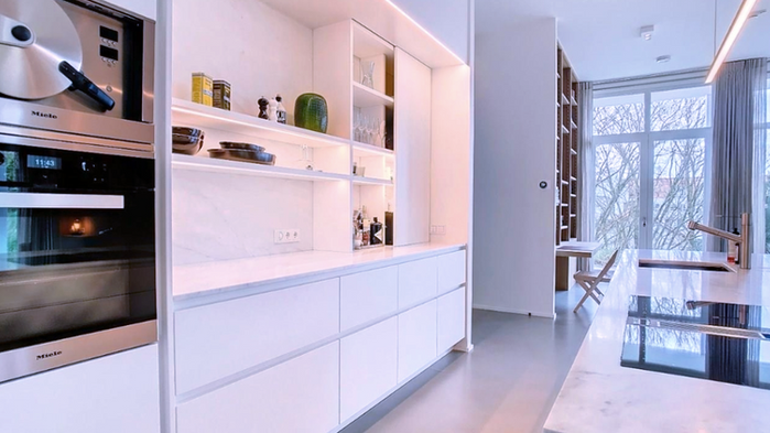 This space is divided by a magnificent partition with a gas fireplace and hidden TV area on the living room side and a wall of cupboards on the dining room side. A wall-mounted bookcase with desk area completes the ensemble. The modern kitchen is a real eye-catcher, equipped with every conceivable appliance, including dishwasher, steamer, built-in oven, refrigerator and induction hob with vacuum system from Miele and Bora. It features a backsplash with various built-in cupboards and a kitchen island, finished with Calcutta marble worktops and backsplash. Are you a wine lover? In the adjacent laundry room is an air-conditioned wine cellar with ample storage space and equipped with an additional freezer.