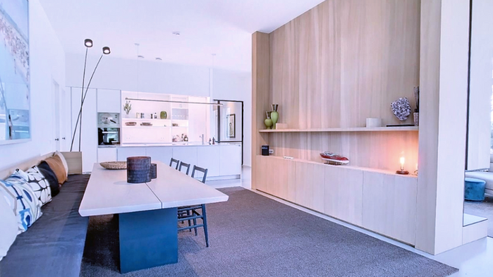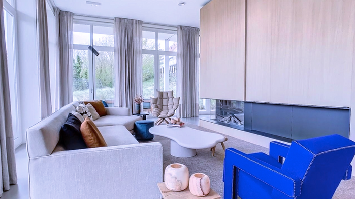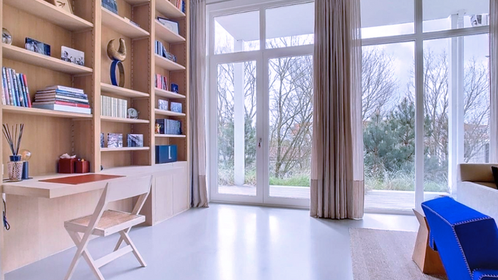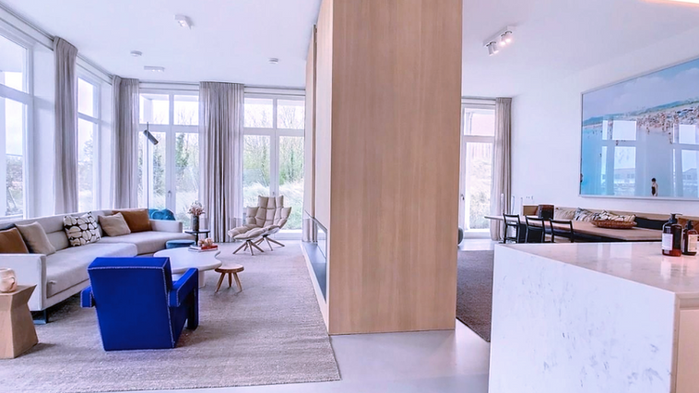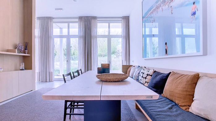 The living-dining room with open kitchen is the heart of this modern home. You can relax and enjoy the well-being that surrounds you. You can step out onto the large south- and west-facing terraces, or onto your own terrace in the dunes, to literally bring the outside in.