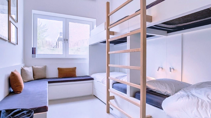 To the right of the kitchen, you’ll find the night hallway with built-in cupboard, the machine room with washing and drying facilities and the third bedroom with built-in cupboard and French windows opening onto the west-facing terrace, as well as the fourth bedroom with double bunk beds, sitting area and built-in cupboard.