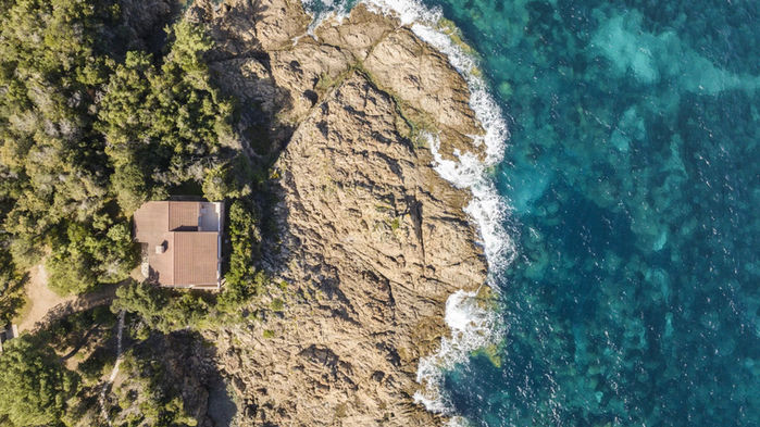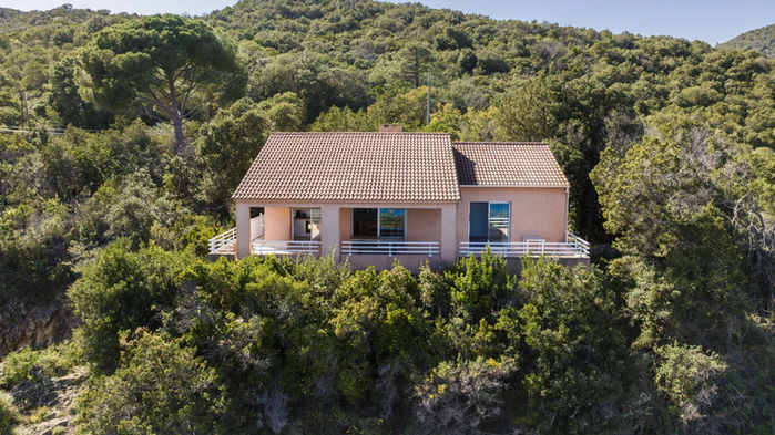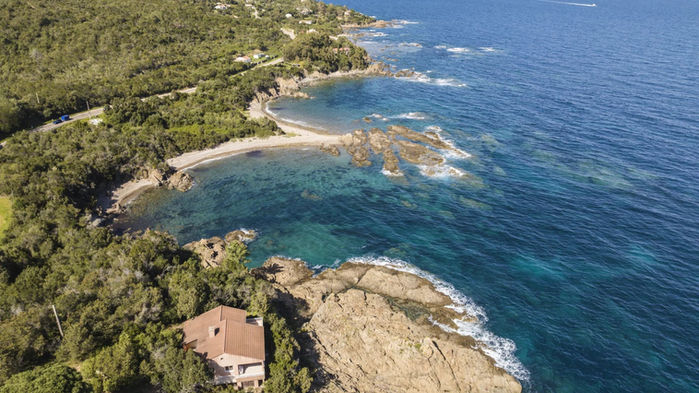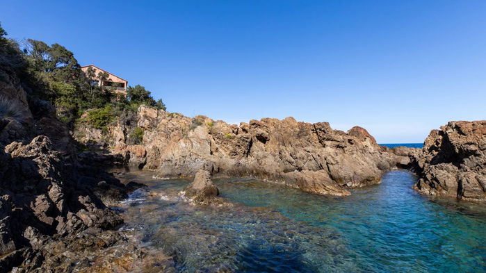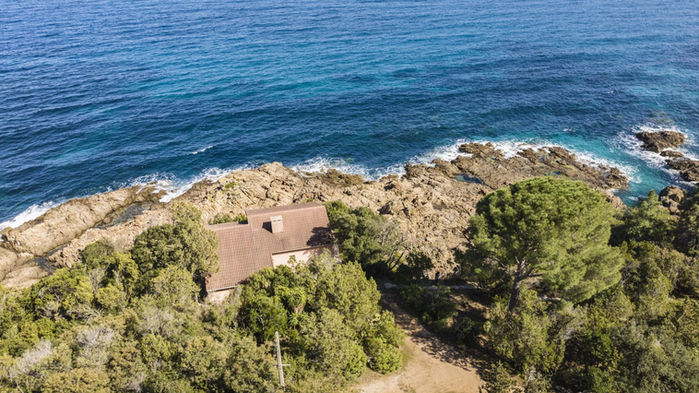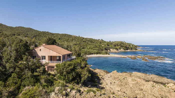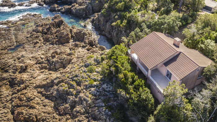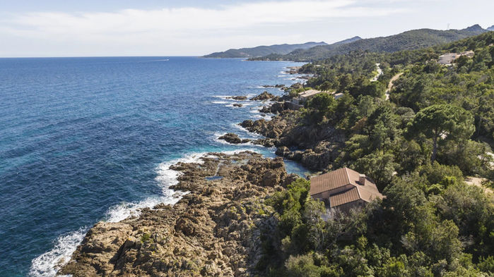 Perched on a rocky promontory, the villa faces the Mediterranean, offering a 180° panorama of the sea and direct access to the water thanks to a furnished platform. Built in 1993, the villa comprises a ground level and a lower level. Traditional in design, it consists of a living room, an open kitchen, four bedrooms, two of which have private bathrooms and an east-facing terrace, for a surface area of approximately 150 m². The waterfront land offers approximately 5,100 m².